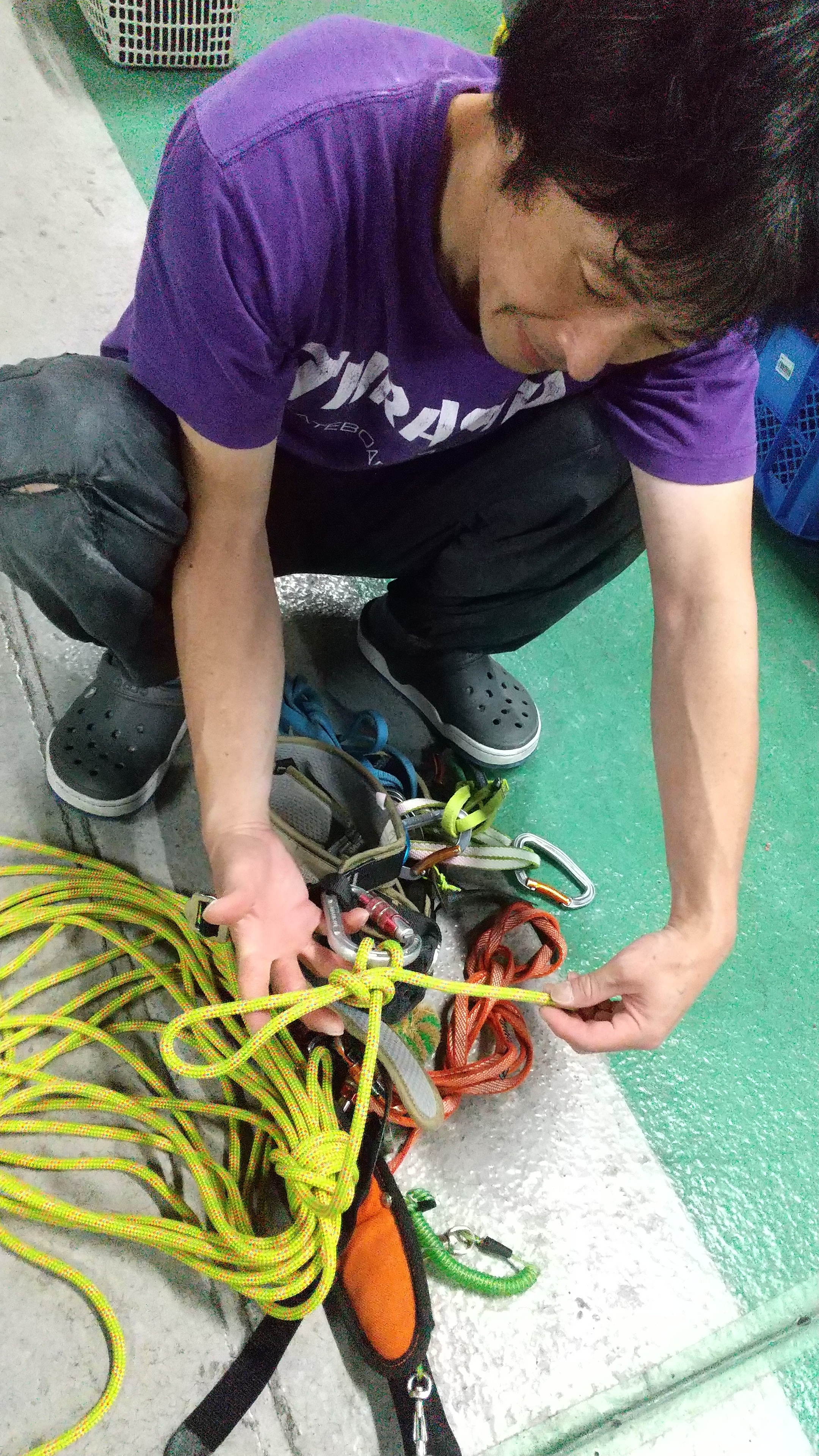 ※セットが終わり帰ろうとしている大西さんを引き留め、先日行われた大西さんの台湾遠征「新武呂渓」のキャニオニングの過程で気になっていたところを大西さんに色々と伺いました。写真は、滝壺や流れがある場所への懸垂下降をする際のロープワークについて教えていただいているところ。